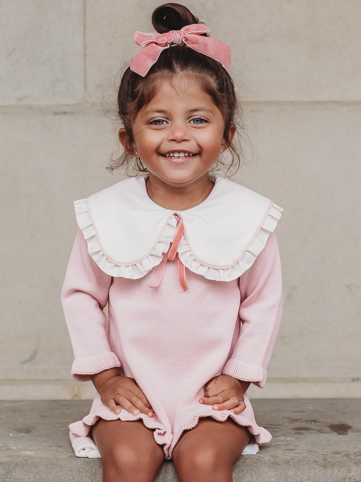The most beautiful statement collar dress from our 'Darling Collar Collection.' Beautiful soft knitted dress with ruffle to the sleeve & hem, finished with a woven statement collar, piped in beige, finished with a darker beige velvet bow. Button fasten to the back neck for comfort