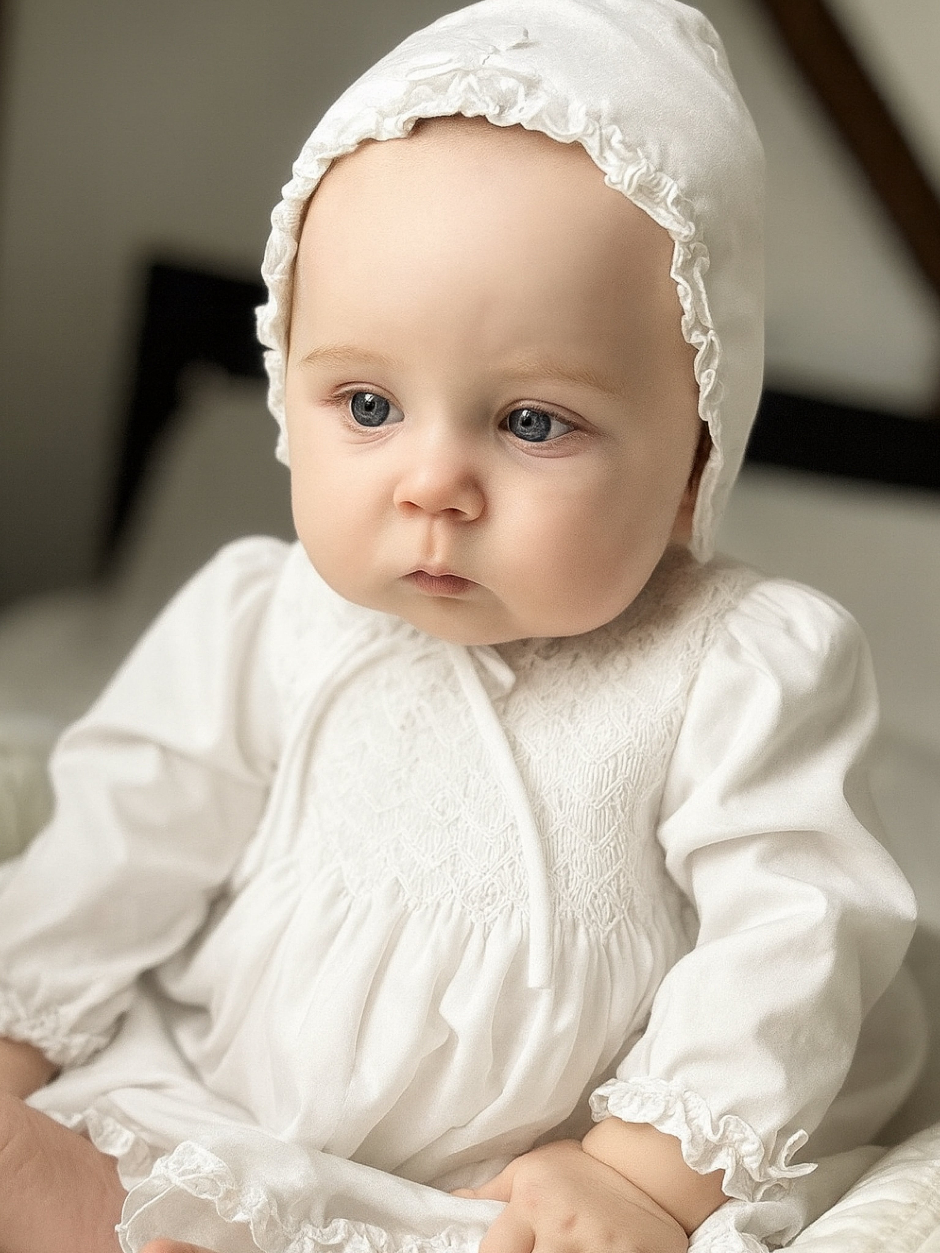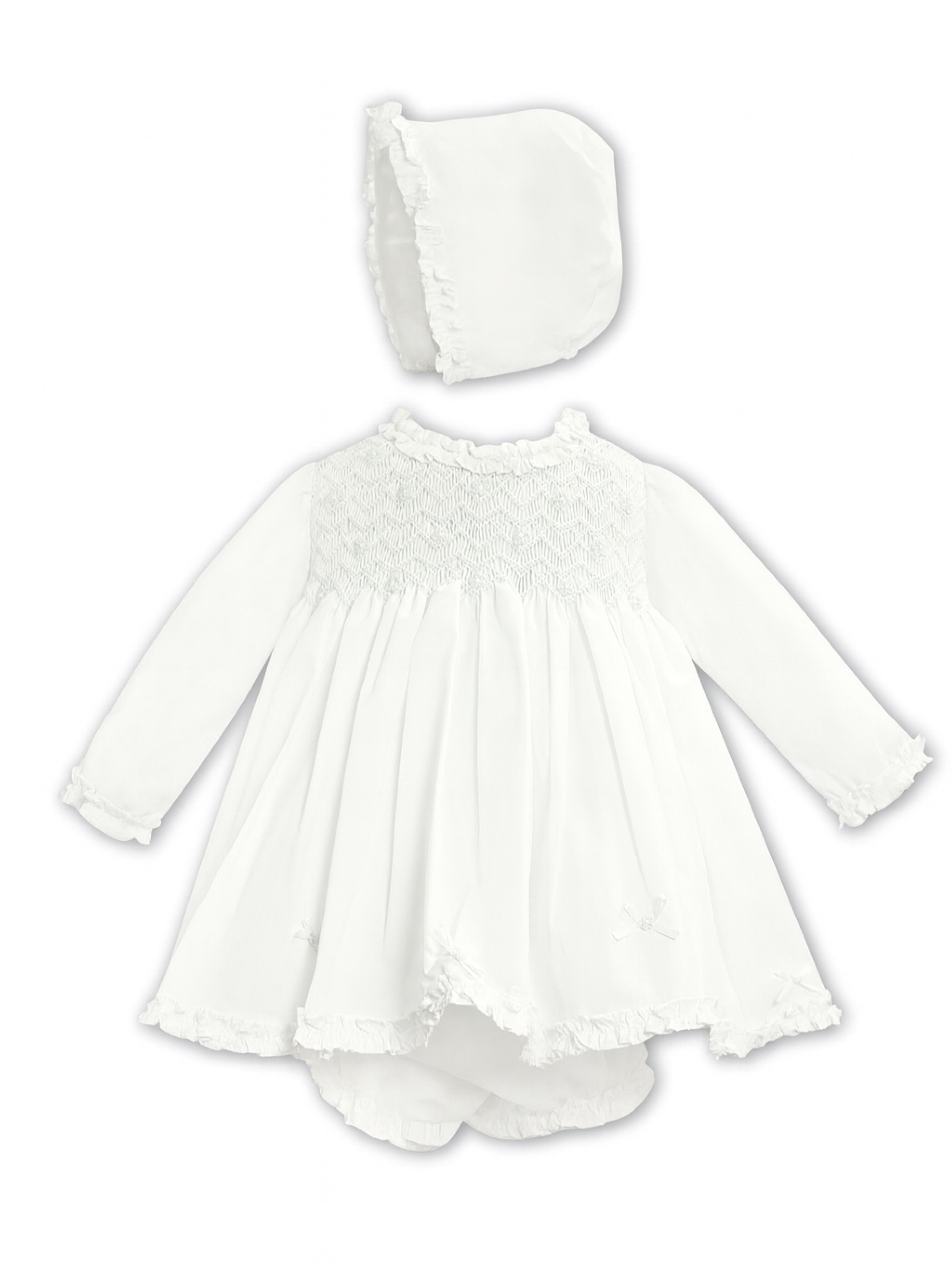 Introducing the sweetest baby dress for your precious new baby girl. This gorgeous 3 piece set includes a hand smocked dress, matching bonnet and frilly pants. The flowers are hand embroidered and the dress has ruffle detail at the neckline and hem. A small satin bow makes this outfit perfect
