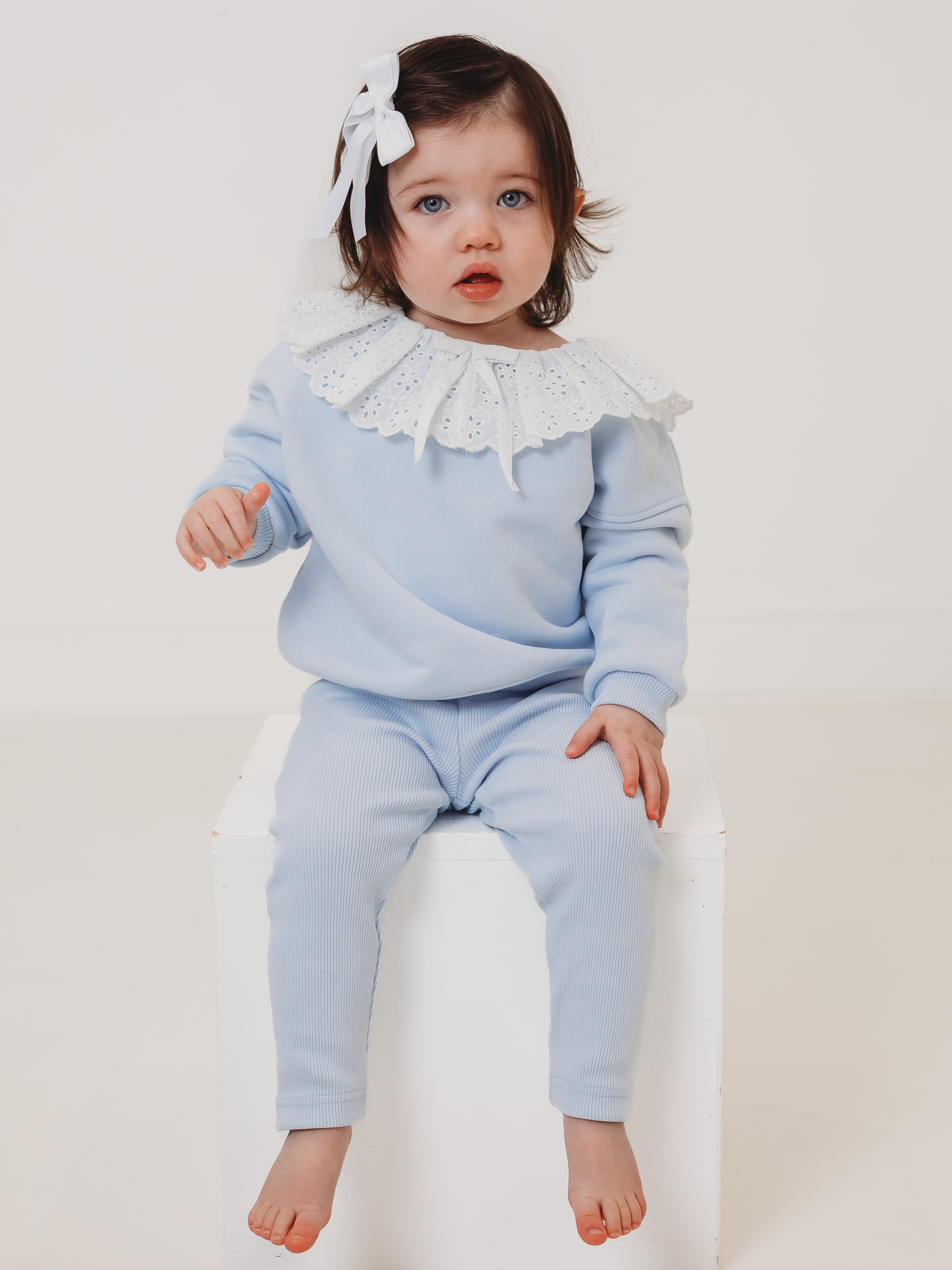 Maeve Blue broiderie anglais frill collar top & ribbed legging set
