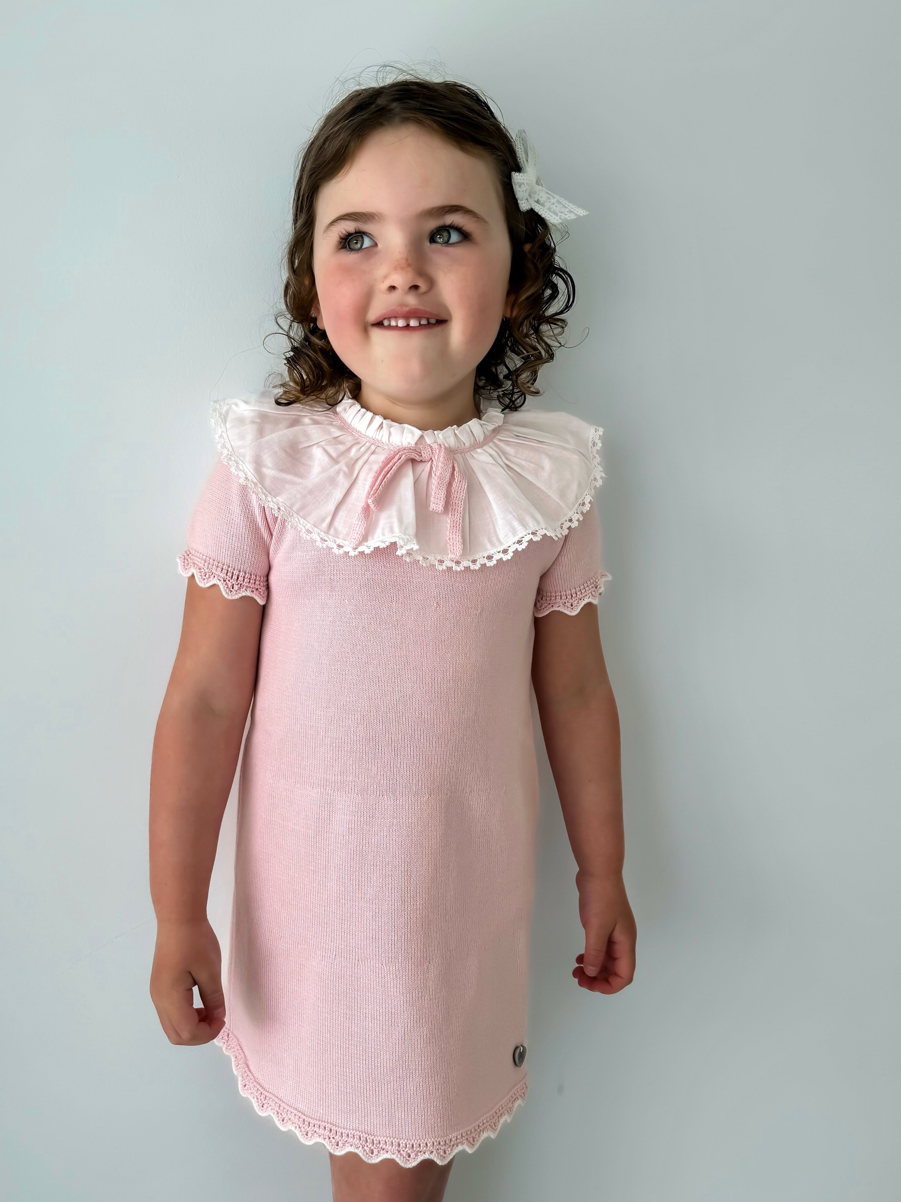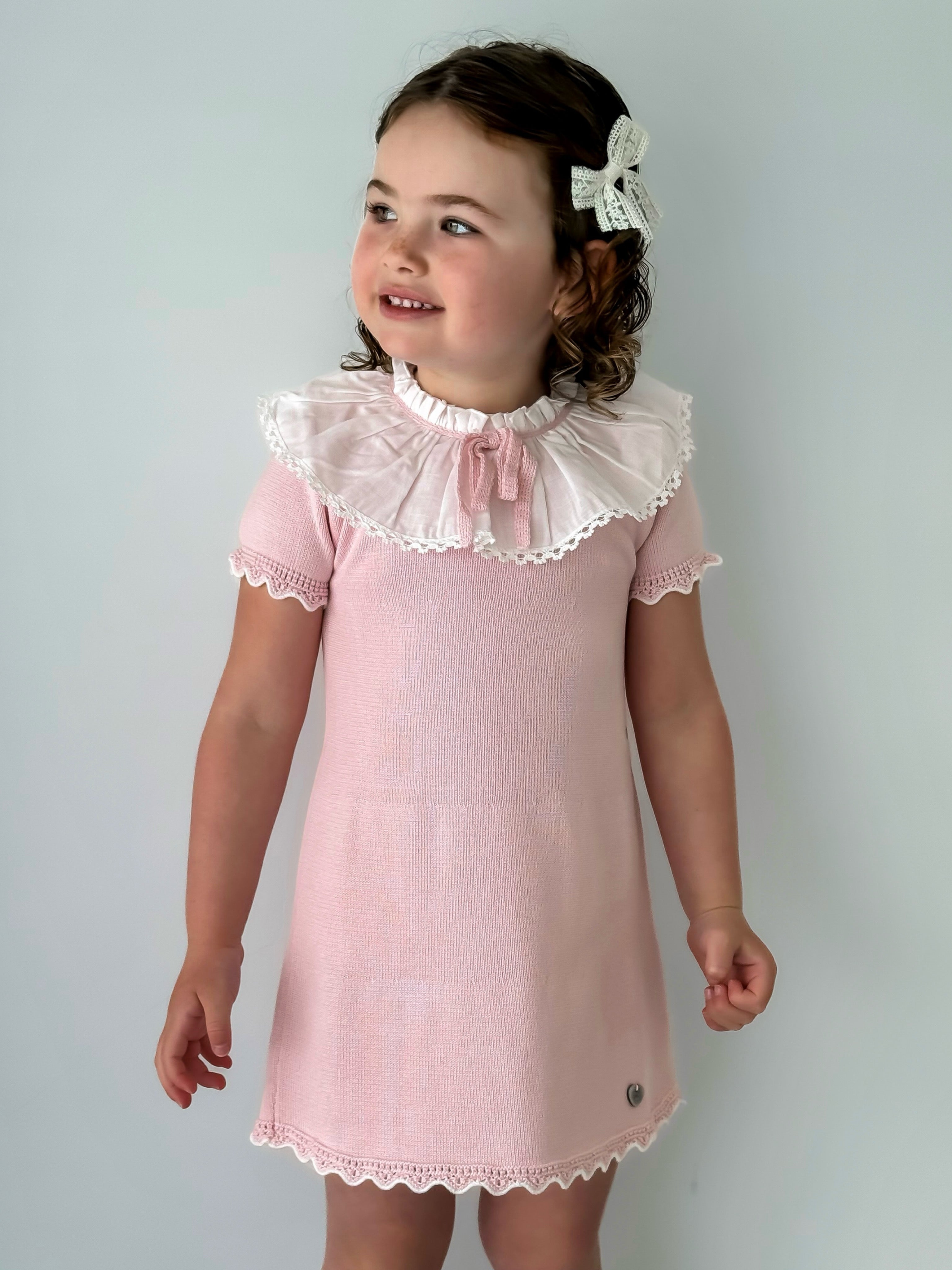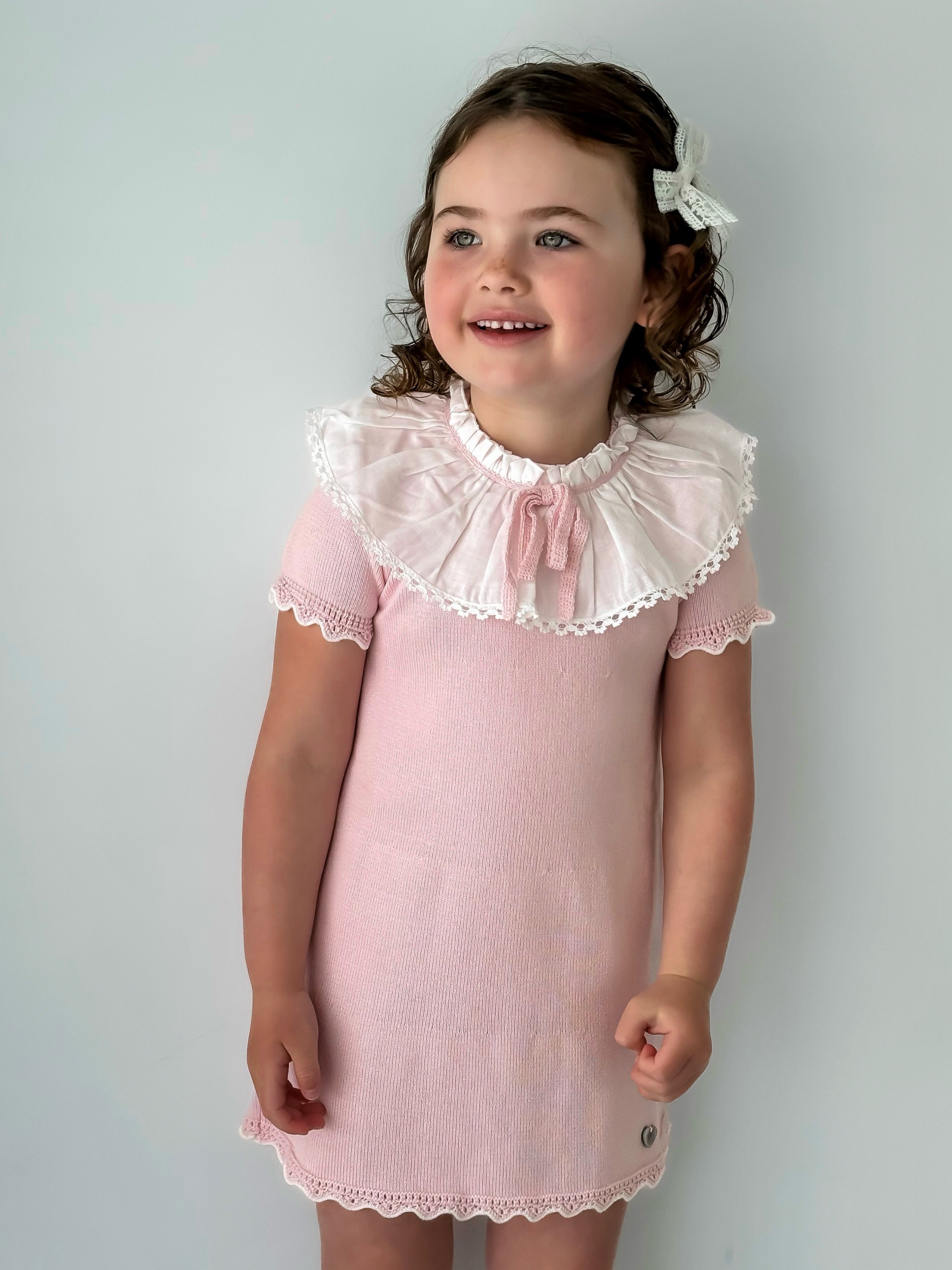 Introducing 'Millie' the latest addition to our Rose and Albert Collection. Soft knit dress with woven statement collar, finished with a knitted bow to the neck. Button fasten to the back neck