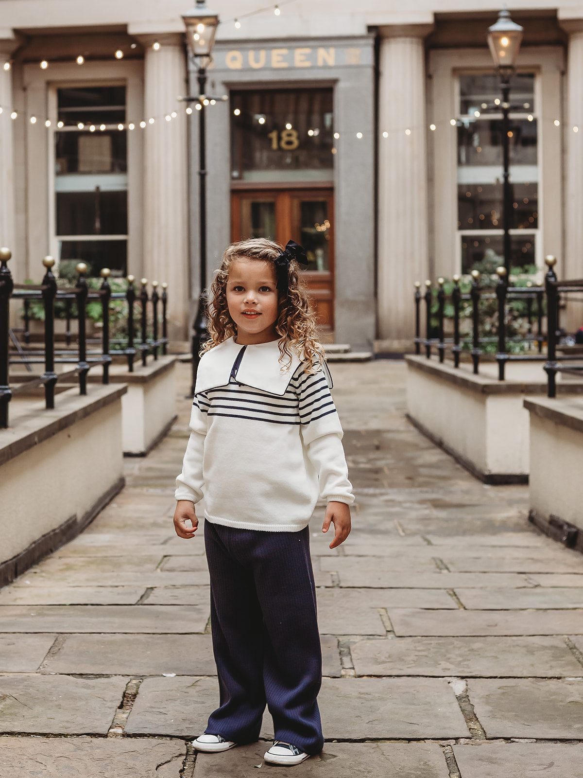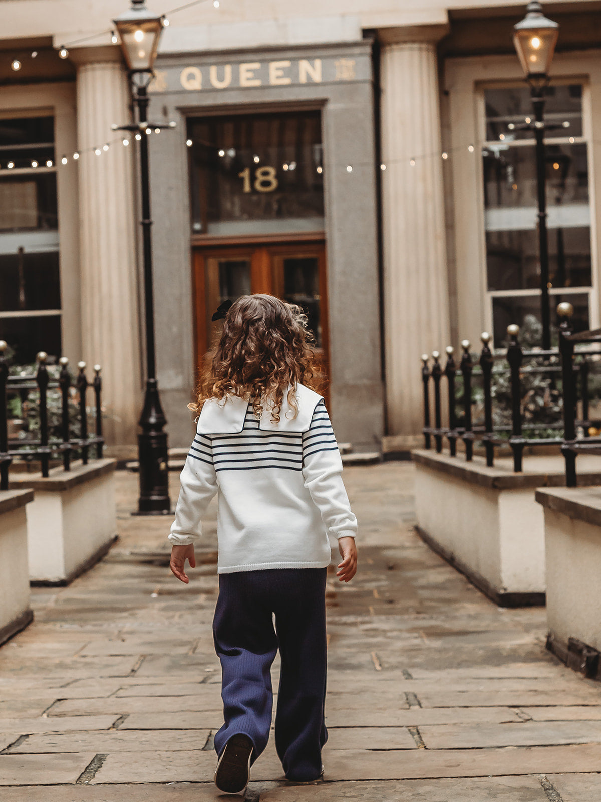 Introducing our 'Little Muse' 2 piece set. Our statement collar, updated for this set with knitted bow to the neck. Stunning half striped jumper with button fasten to the back neck. Paired back with wide leg knitted pants which finish at the ankle.