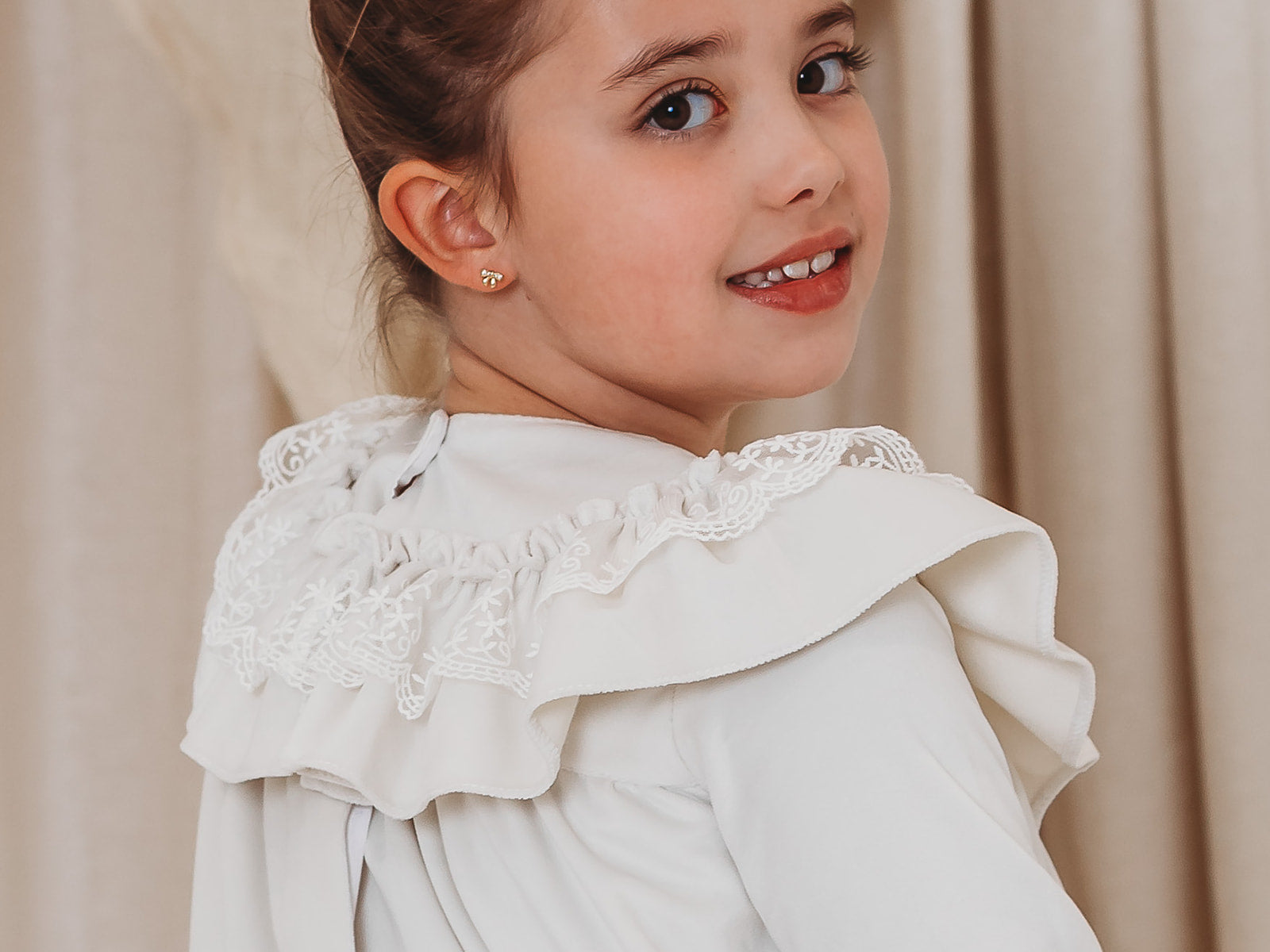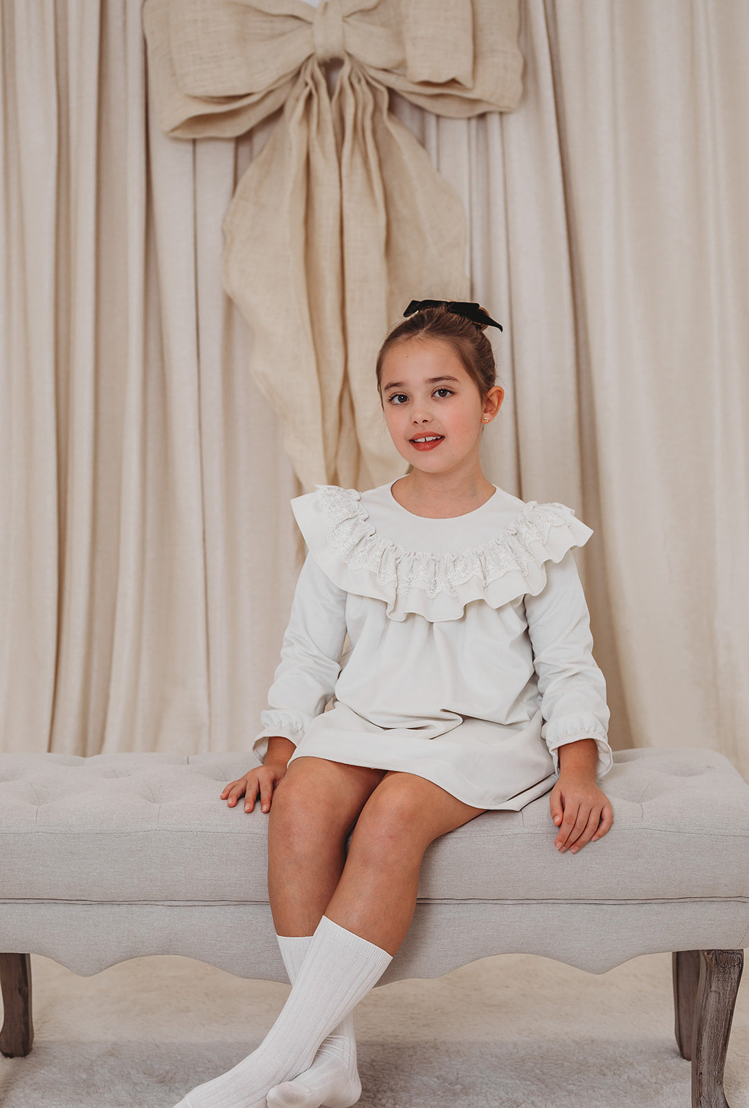 We are so proud to launch our Exclusive Rose and Albert Christmas collection. This dress, from our 'Evie collection' uses the most luxurious velvet fabric. Stunning frill to the top, finished with lace, detail goes round to the back! This dress has the 'wow' effect. Fully lined for comfort, & mother of pearl buttons to the back neck