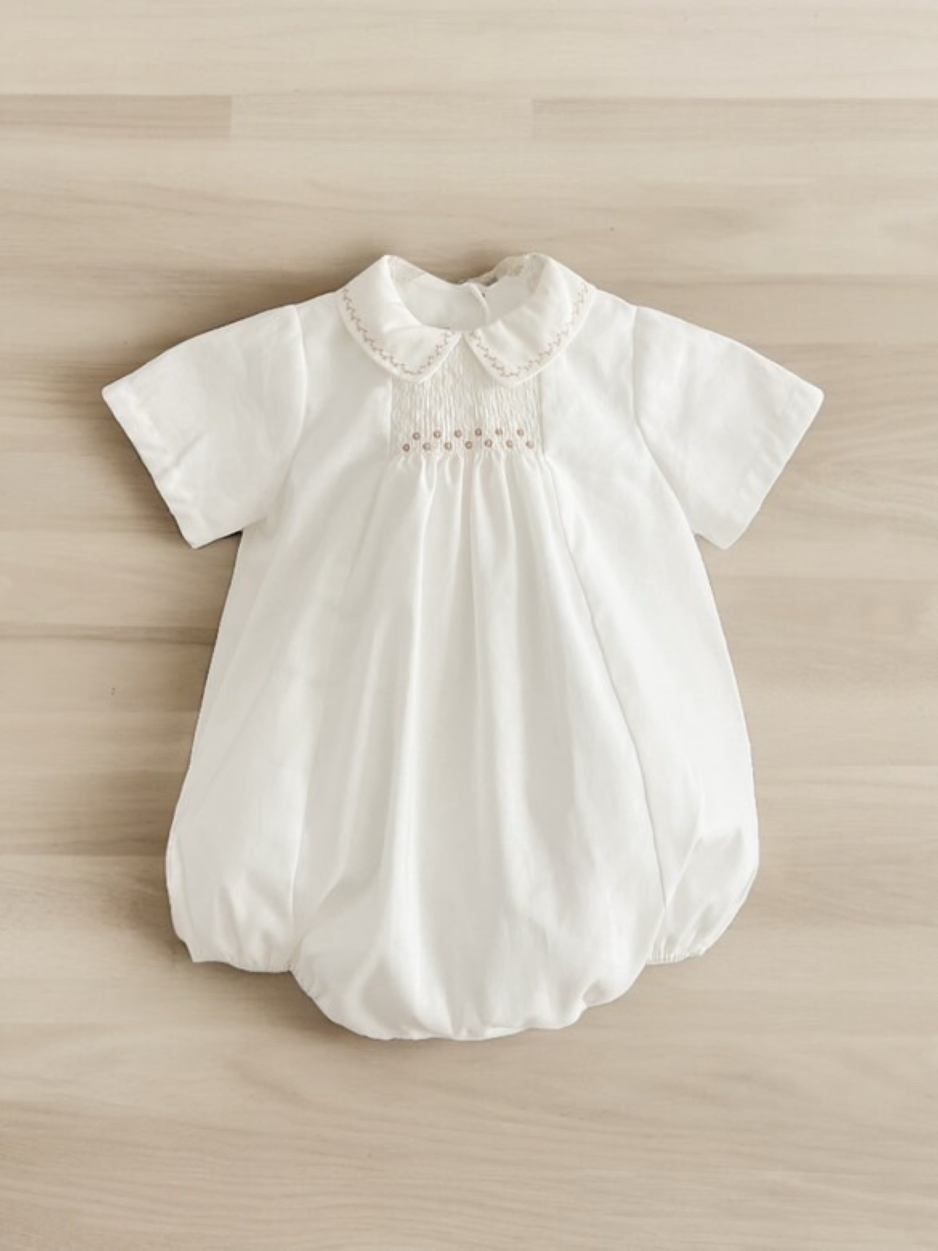Gorgeous short sleeved romper from Portugese brand Fofettes. Stunning soft swiss dot cotton fabric with peter pan collar & contrast smocking to the chest. Button fasten to back neck & crotch