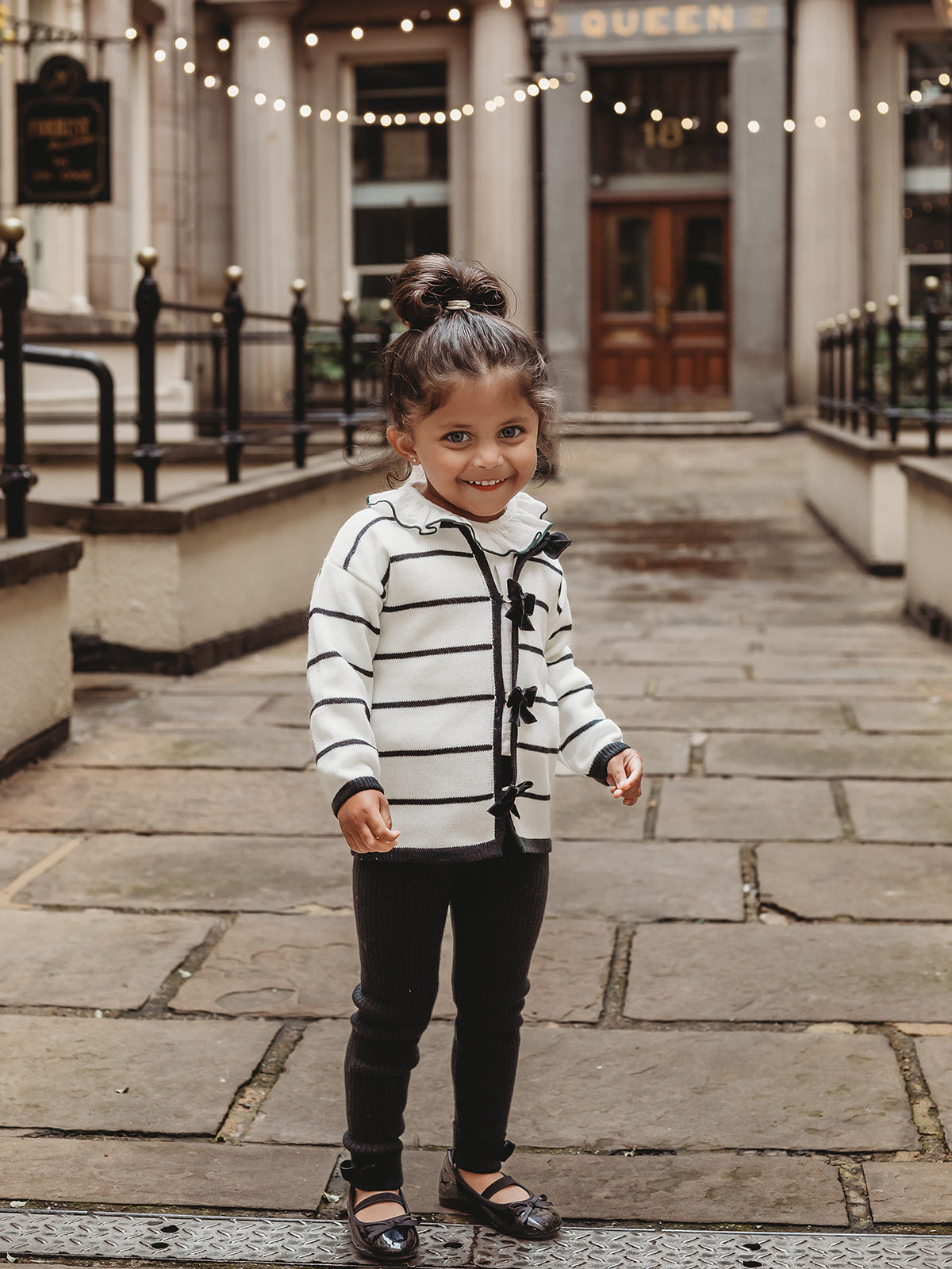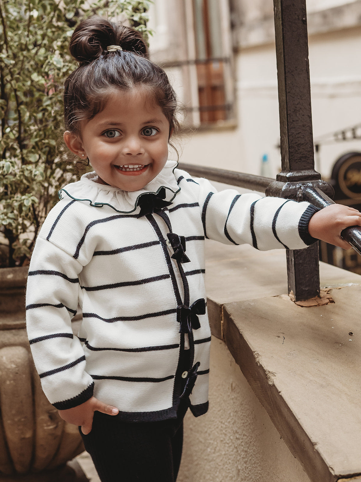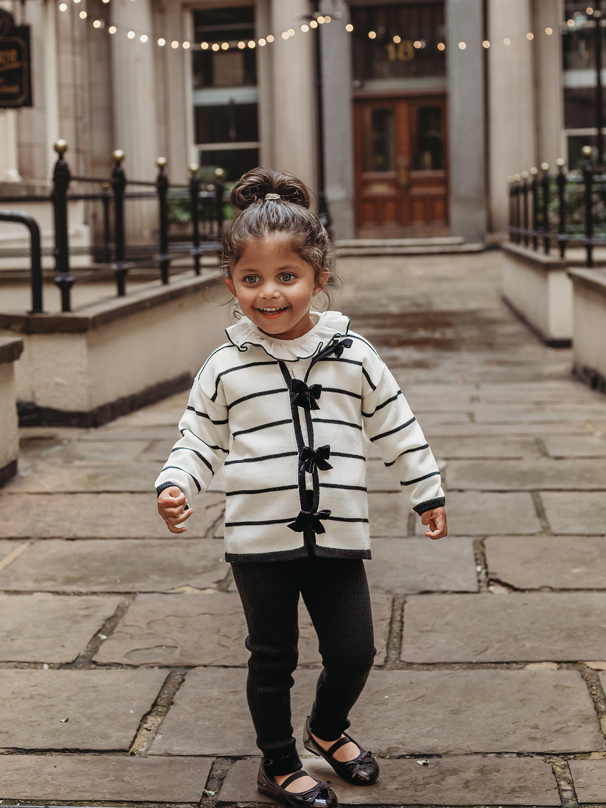 Introducing 'Coco', the most beautiful 2 piece set for girls. Black & off white striped cardigan with velvet bow fasten to the front. Paired back with black skinny ribbed leggings with turn up to the hem & velvet bow. Waist adjusters for the ultimate comfort.