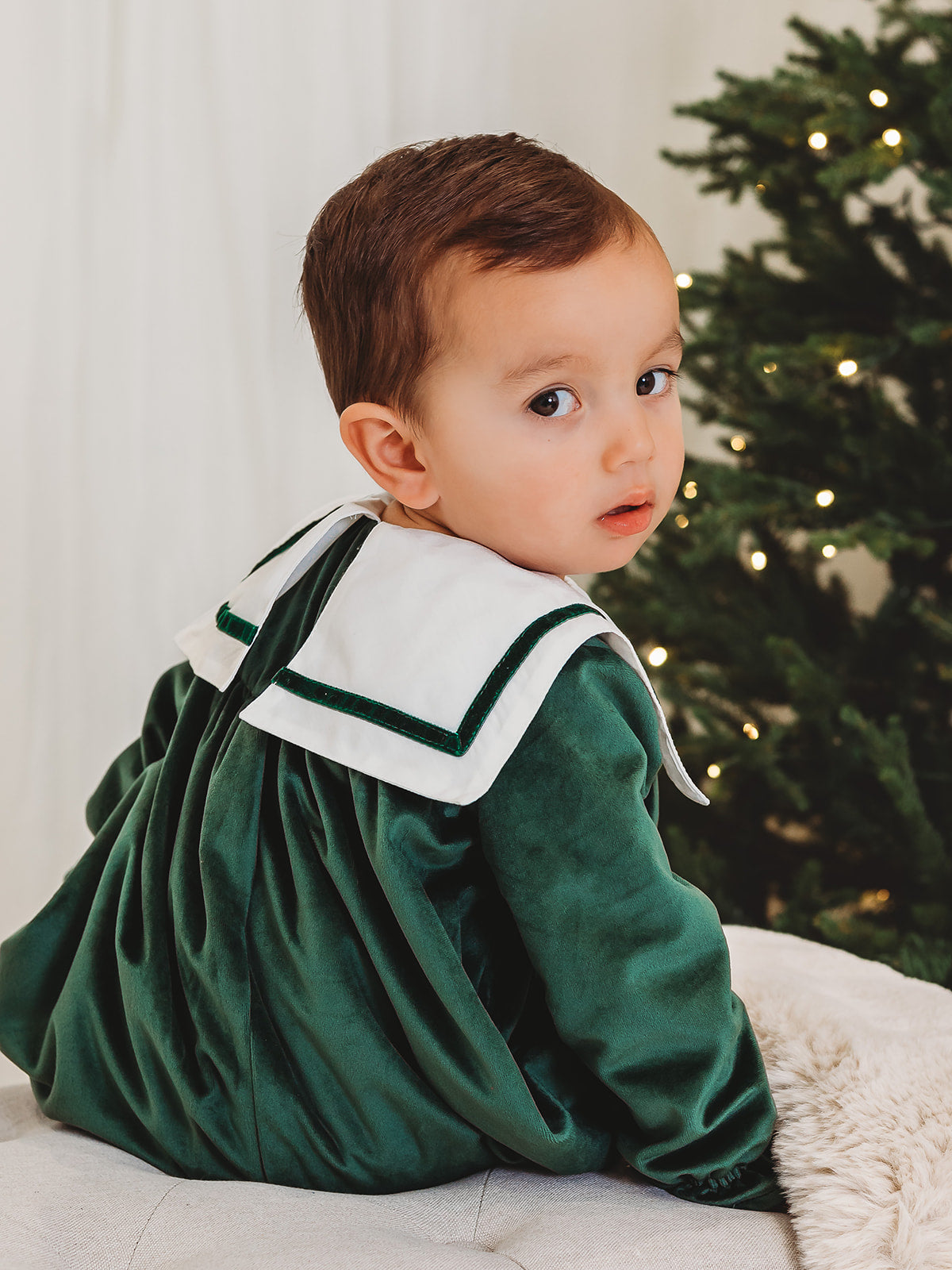 We are so proud to launch our Exclusive Rose and Albert Christmas collection. This romper, from our 'Holly Luxe collection' uses the most beautiful forest green velvet fabric, with a traditional bib sailor collar to the front & back, piped in green velvet. The romper is fully lined for that extra special touch, with mother of pearl button fasten to the back neck.