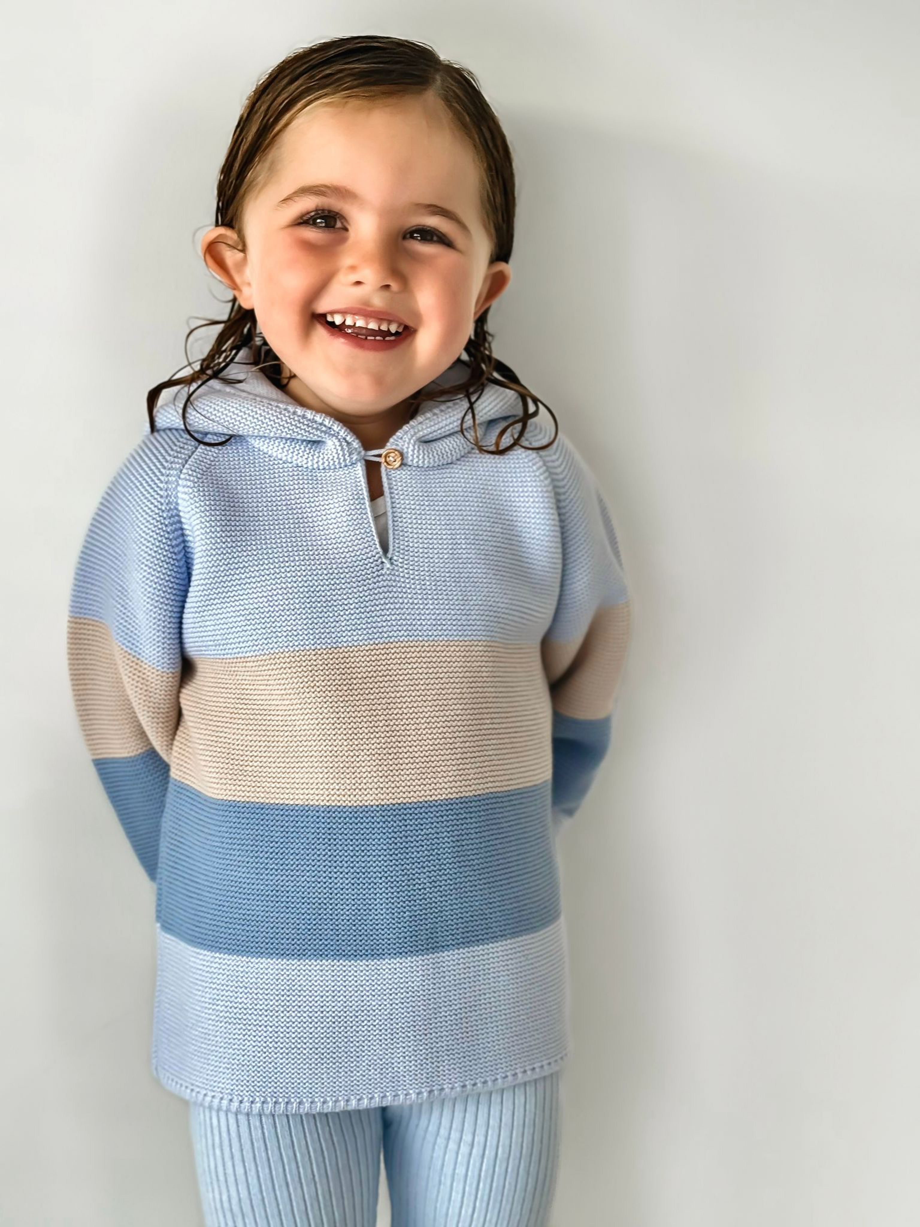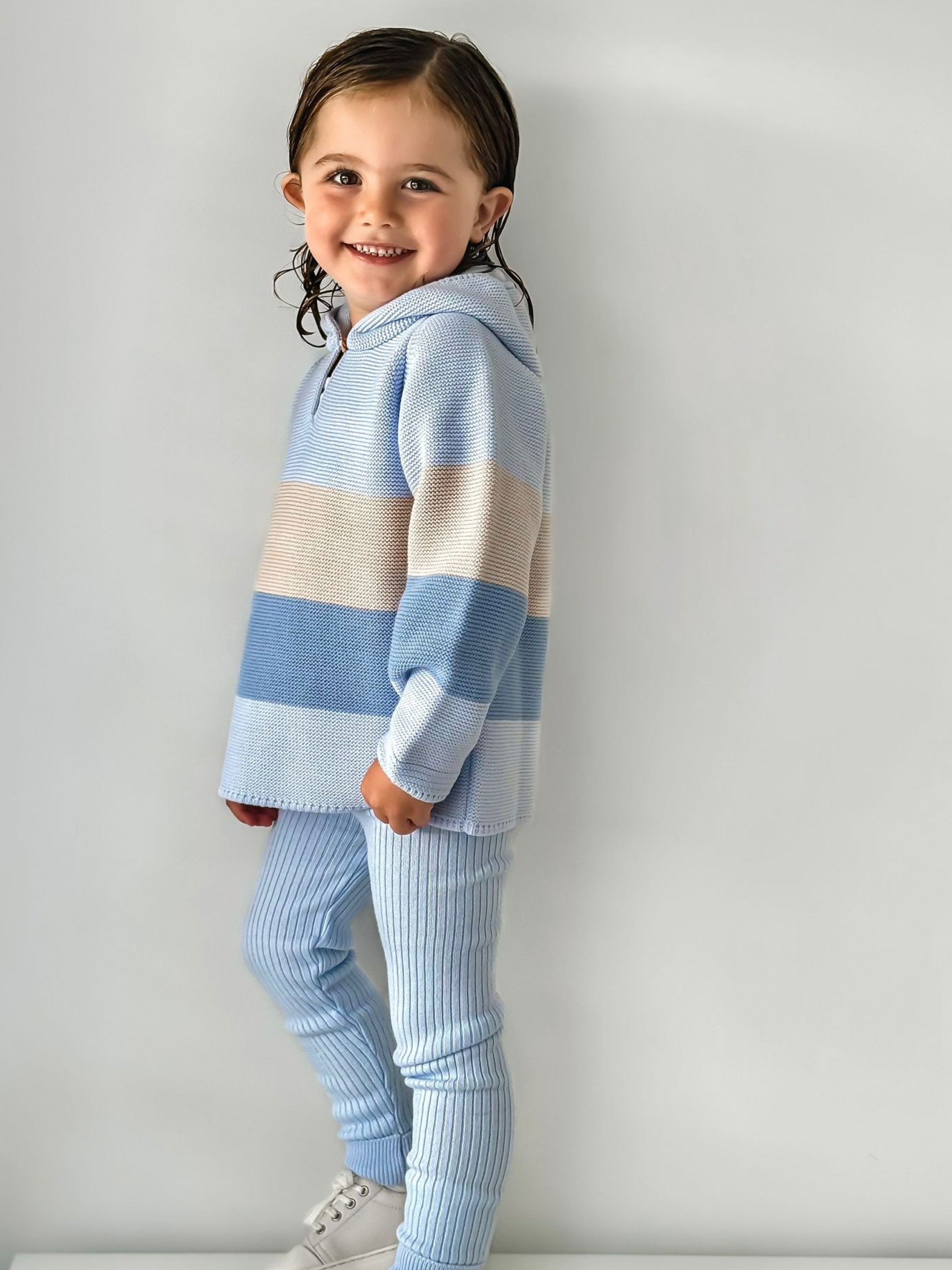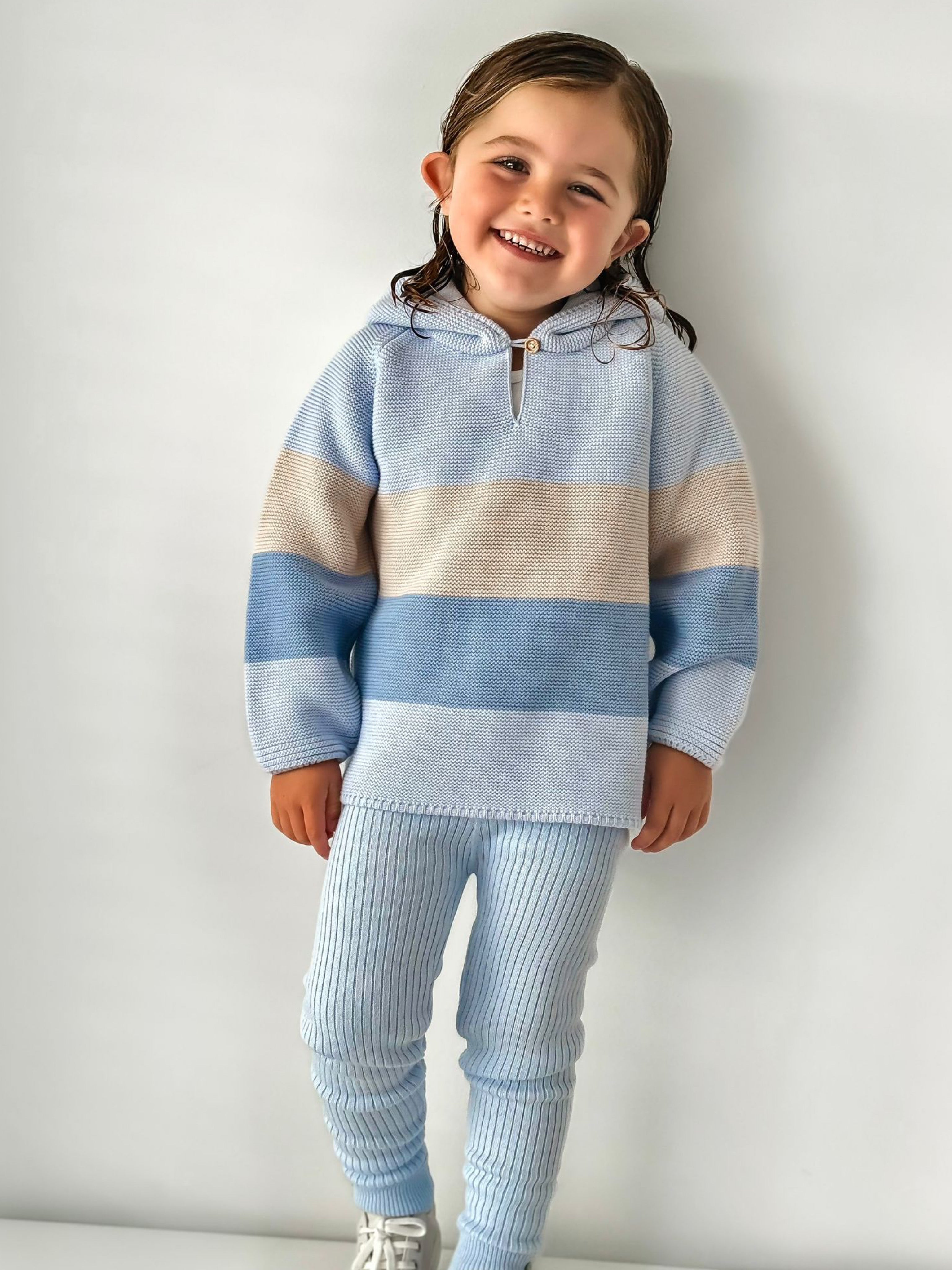 A new style, perfect two-piece set from Spanish brand Artesania Granlei for boys. A long-sleeved chunky knitted hoodie with mock wooden button fasten, contrast stripe design in beige & ivory to the body & arms. Paired together with beige knitted trousers with elasticated and adjustable waist for comfort.