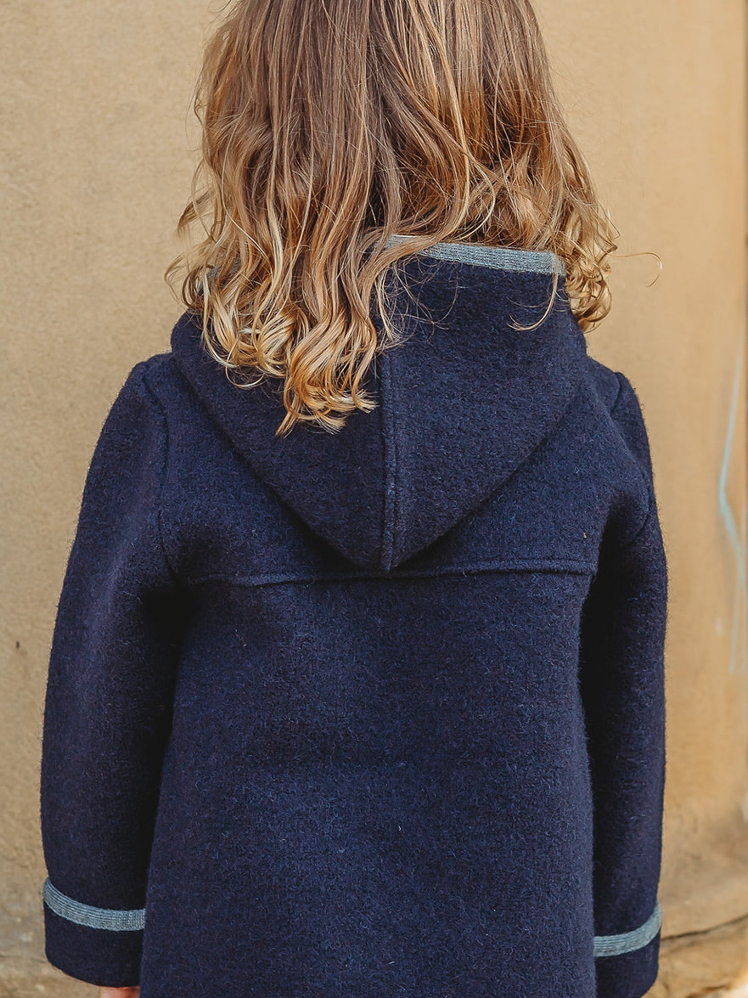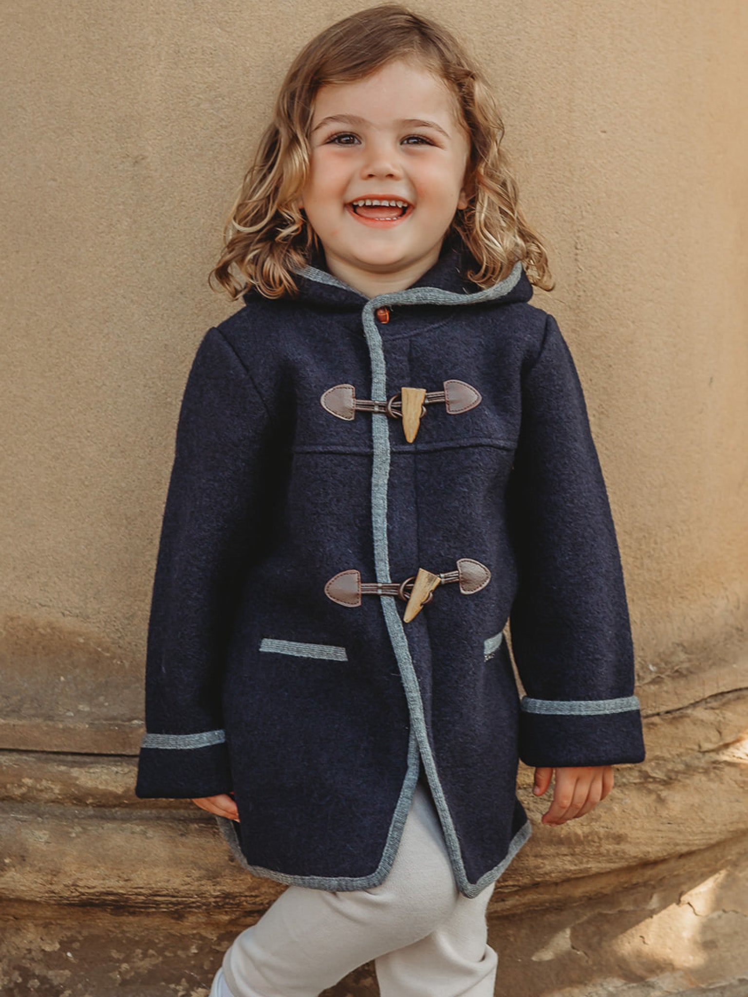 The most beautiful duffle coat from Spanish brand Marae Kids. Navy blue merino wool coat with concealed zip & duffle toggl fasten to the front, Stunning blue piping throughout. Branded Marae tag