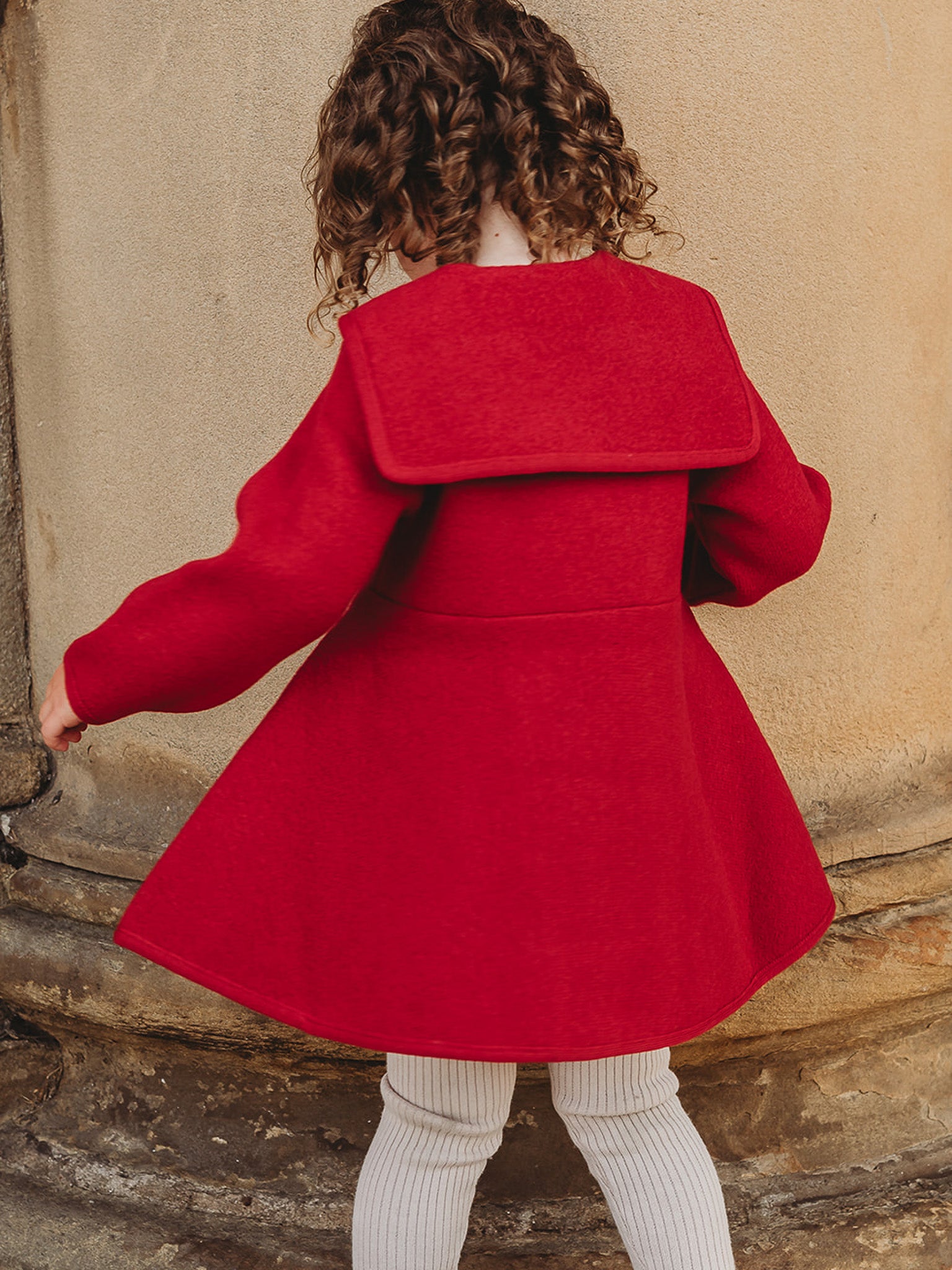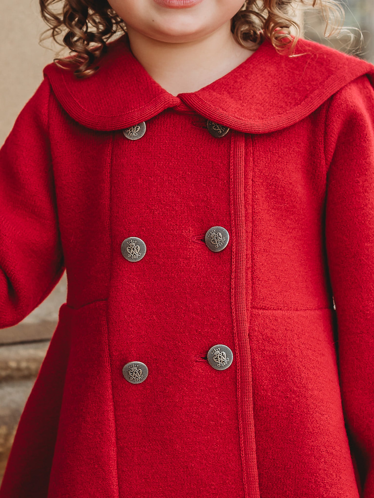 The most beautiful merino wool coat from Spanish brand Marae Kids. Red with double breasted button fasten to the front, sailor collar to the back & branded Marae tag
