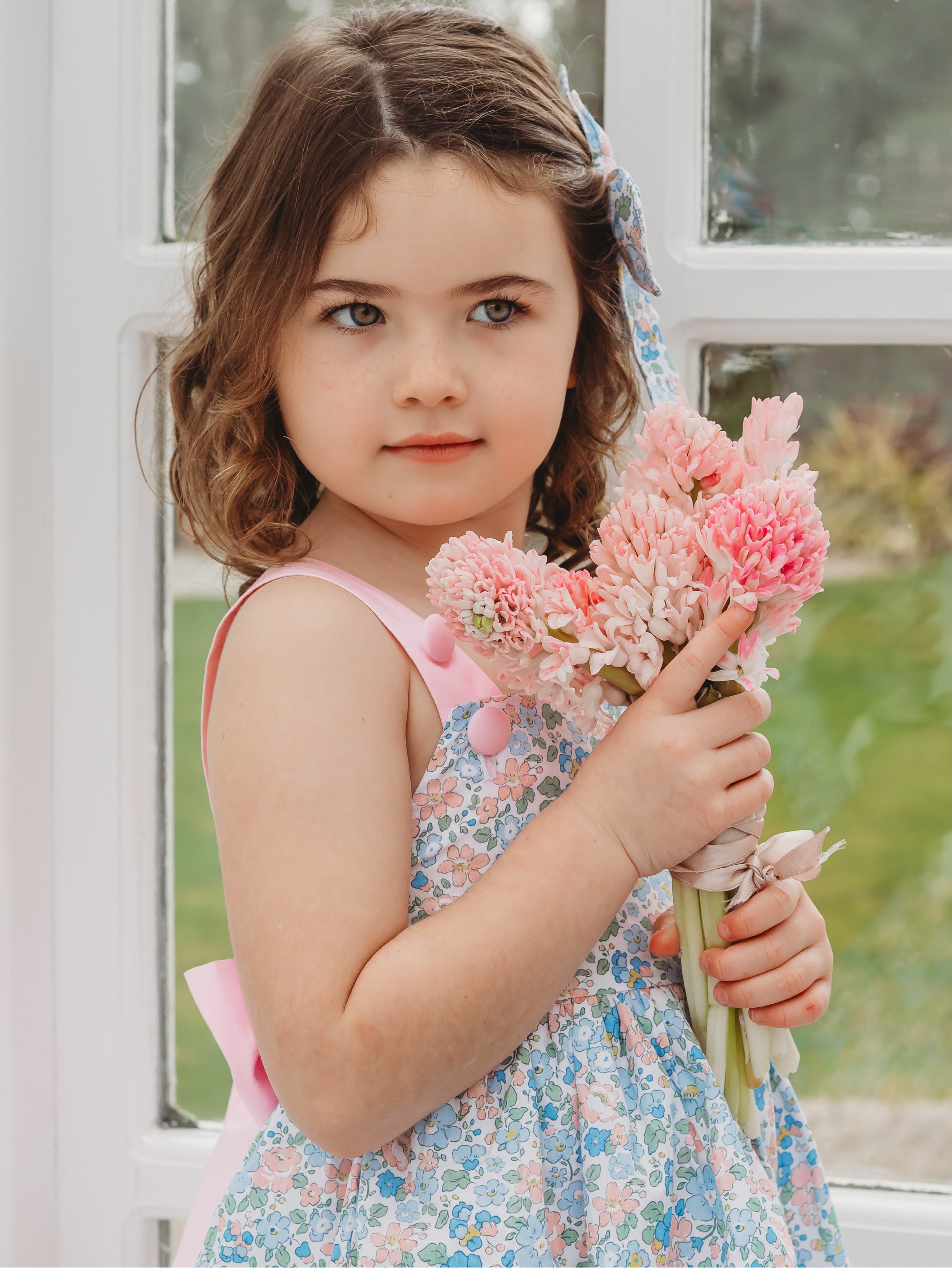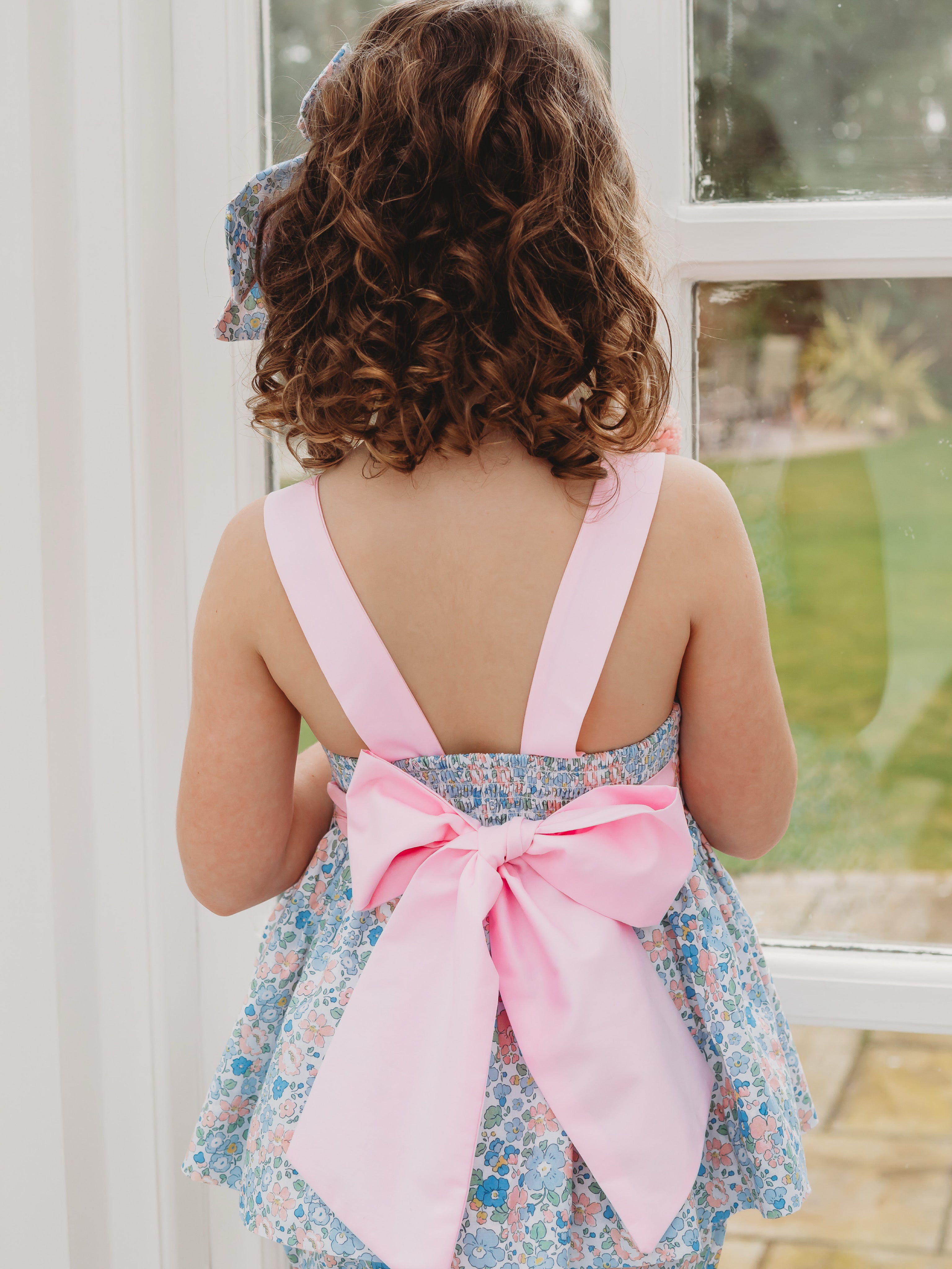 Introducing our latest collection Petal Blossom, featuring the most beautiful Betsy Liberty print. This two piece set features a cotton short dress with contrast pink straps (with adjustable buttons to the front) and a large feature pink bow to the back. Shirring at the back for comfort, item is fully lined. Paired back with matching bloomer knickers with elastication to the waistband and leg for comfort
