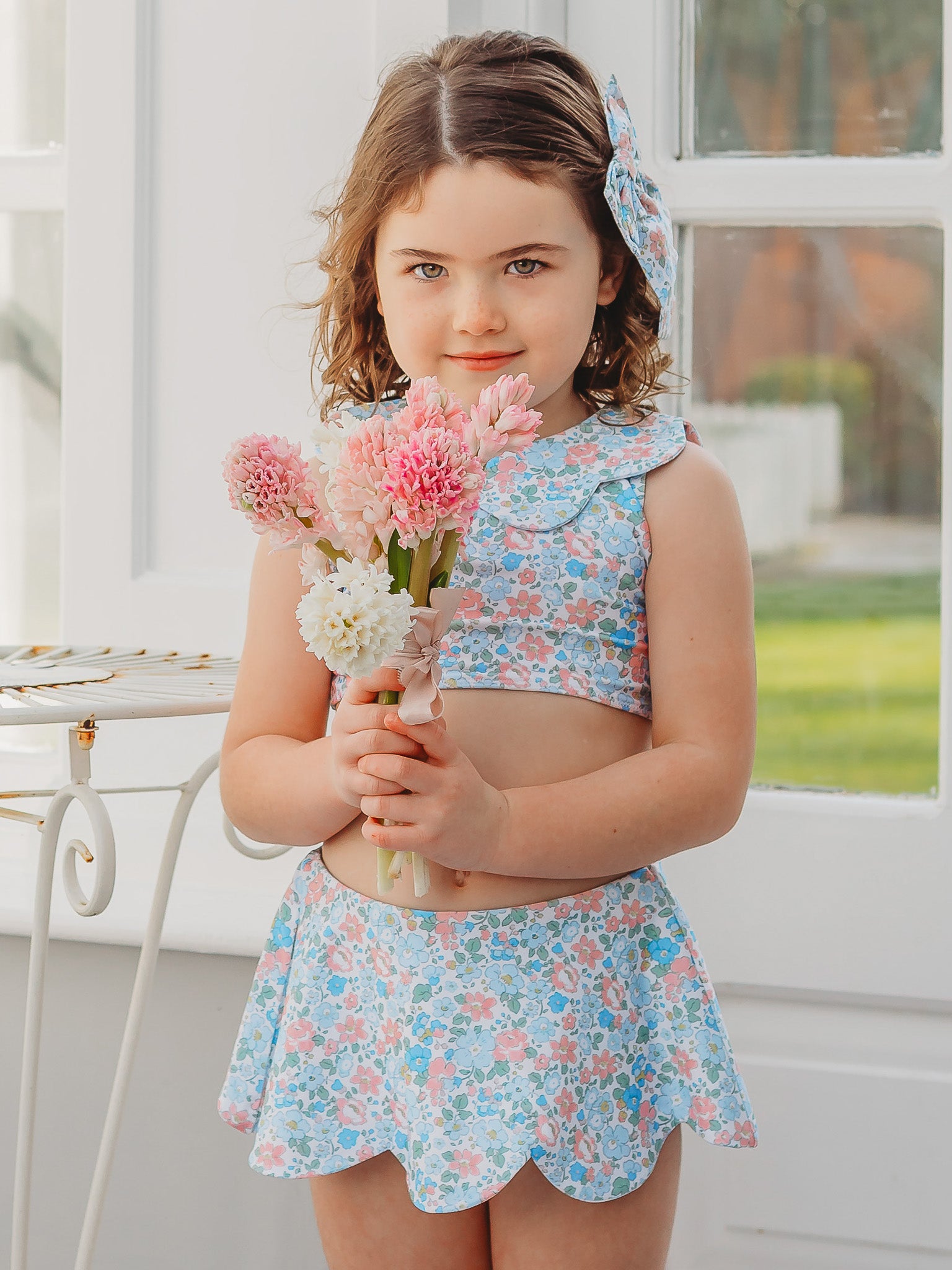 Introducing our latest collection Petal Blossom, featuring the most beautiful Betsy Liberty print. This two piece swim set features petal collar, with zip fasten to the back. Paired back with a swimskirt