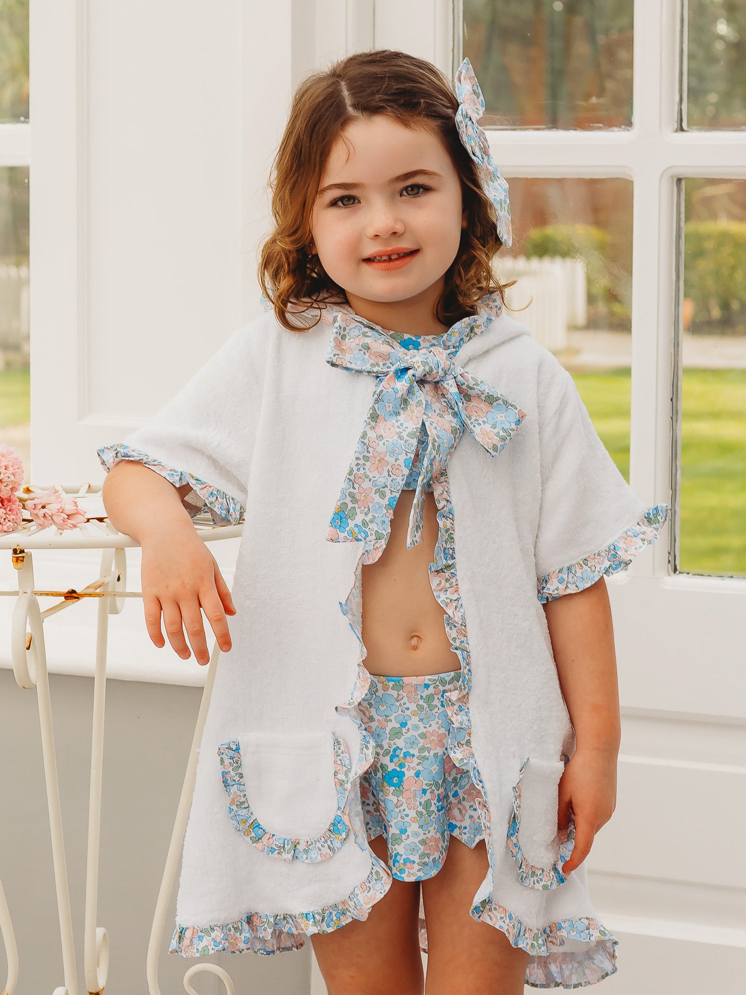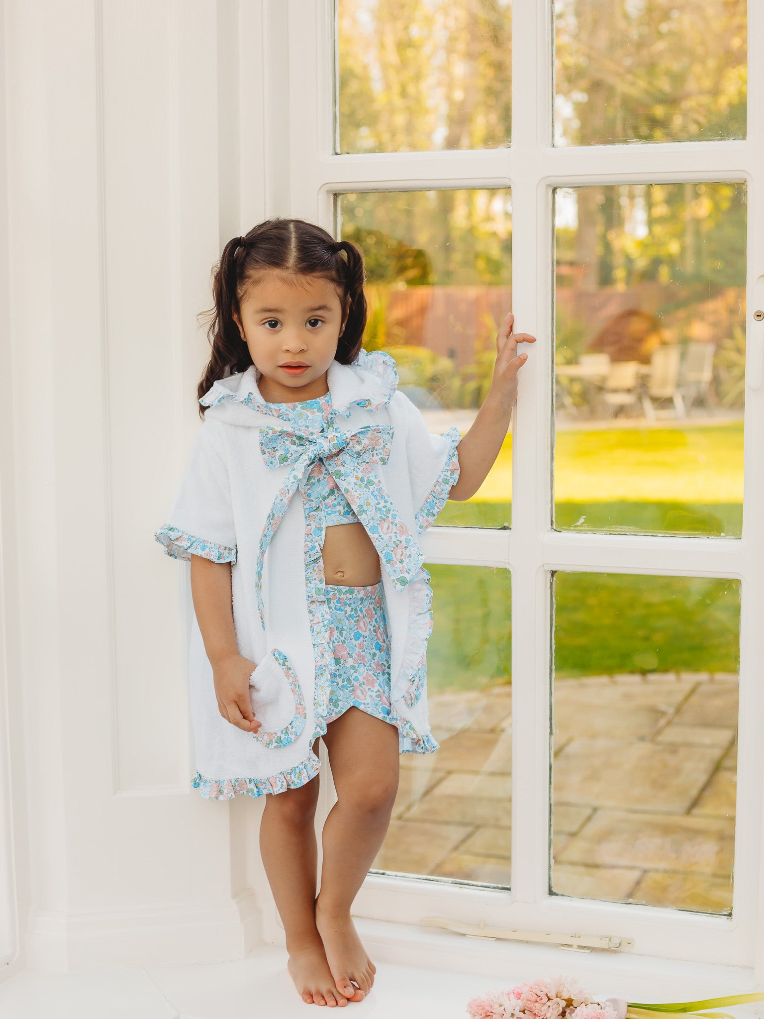 Introducing our latest collection Petal Blossom, featuring the most beautiful Betsy Liberty print. This stunning organic cotton towelling poncho features Liberty print trims throughout, with pockets to the front & a tie to the neck