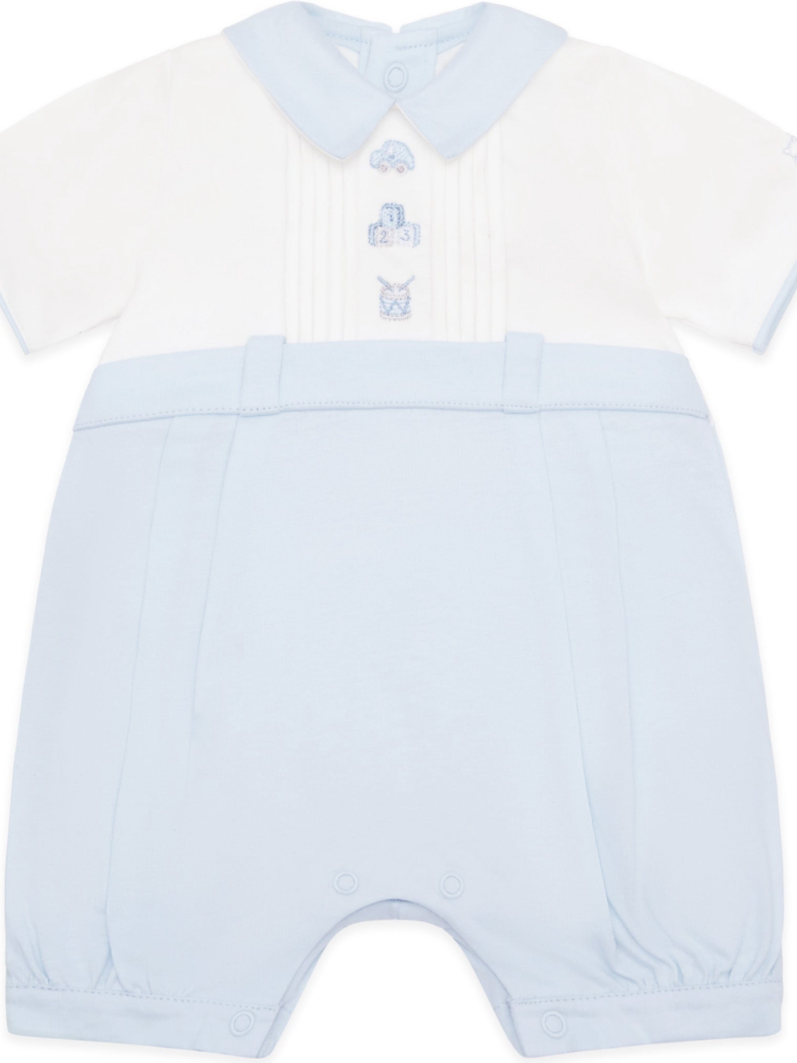 Cool blue springs to mind with this delightful little romper! Nursery toy embroideries, tiny horizontal pintuck pleats and a blue collar and sleeve trim are a winning combination. The lower part of the romper is also blue with little belt loops adding a lovely finishing touch to this must have garment.