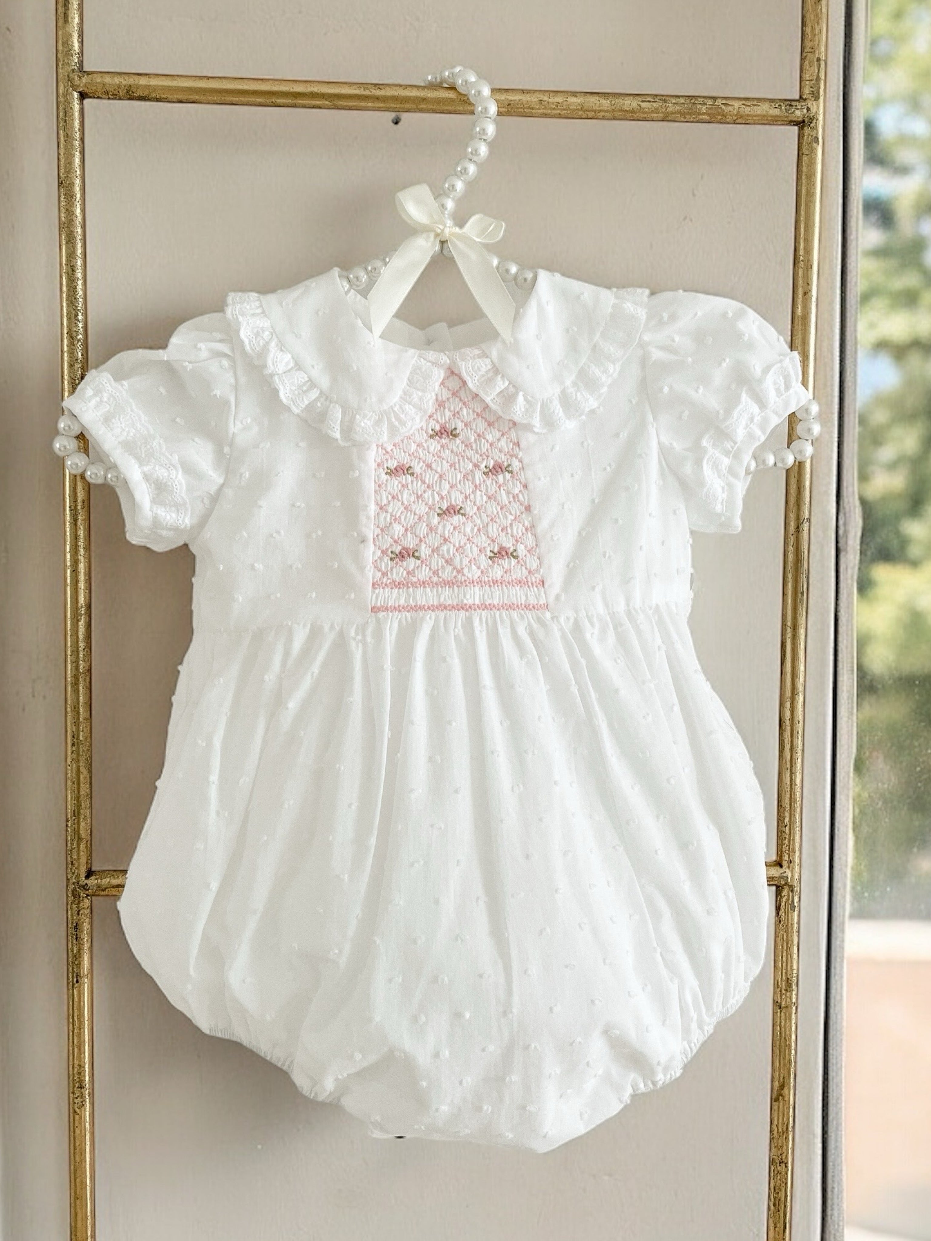 The most beautiful short sleeved romper from Portugese brand Fofettes. Gorgeous swiss dot fabric with stunning embroidered flowers to the chest. Little frill collar to the neck with button fasten to the back & crotch