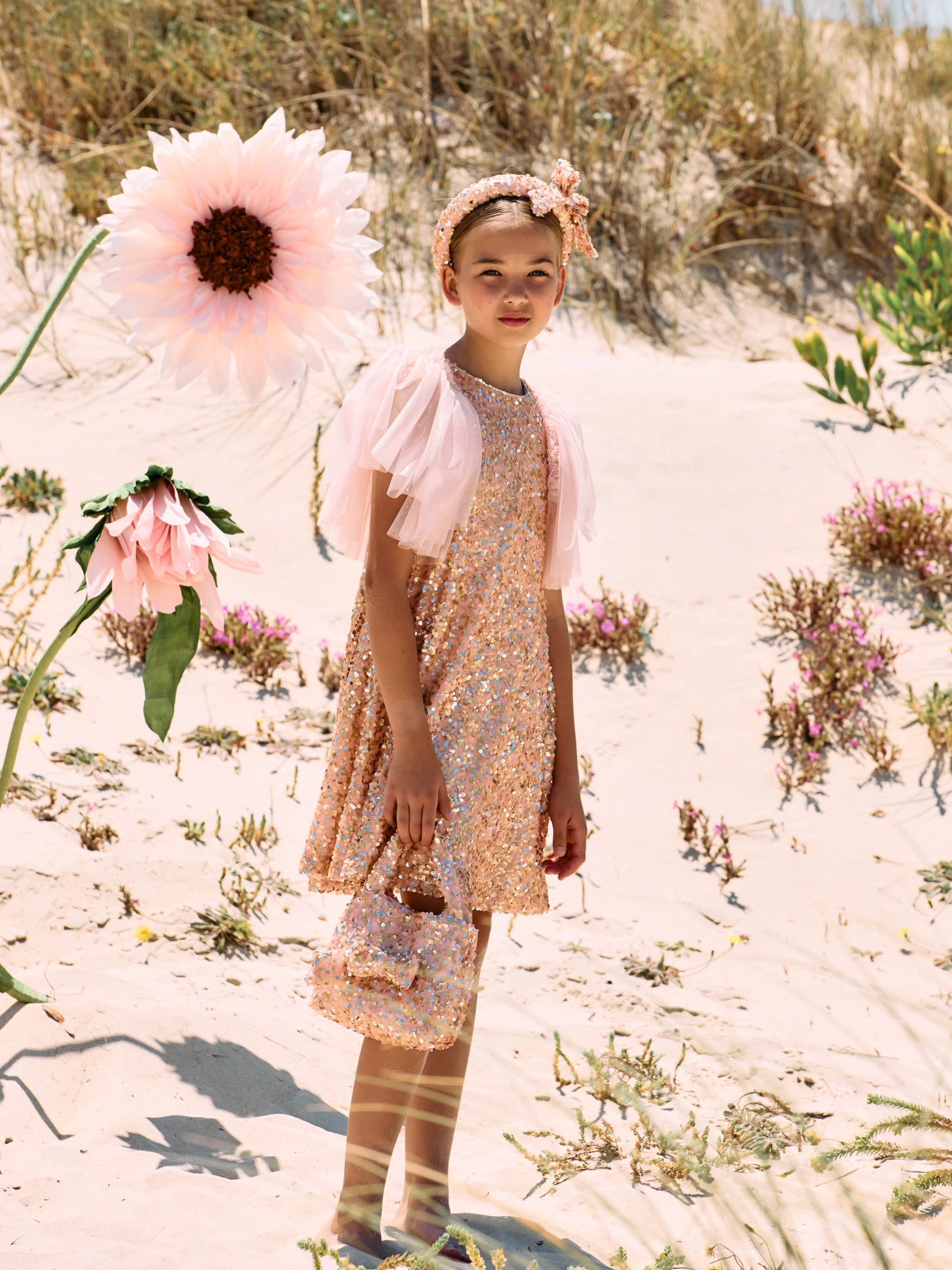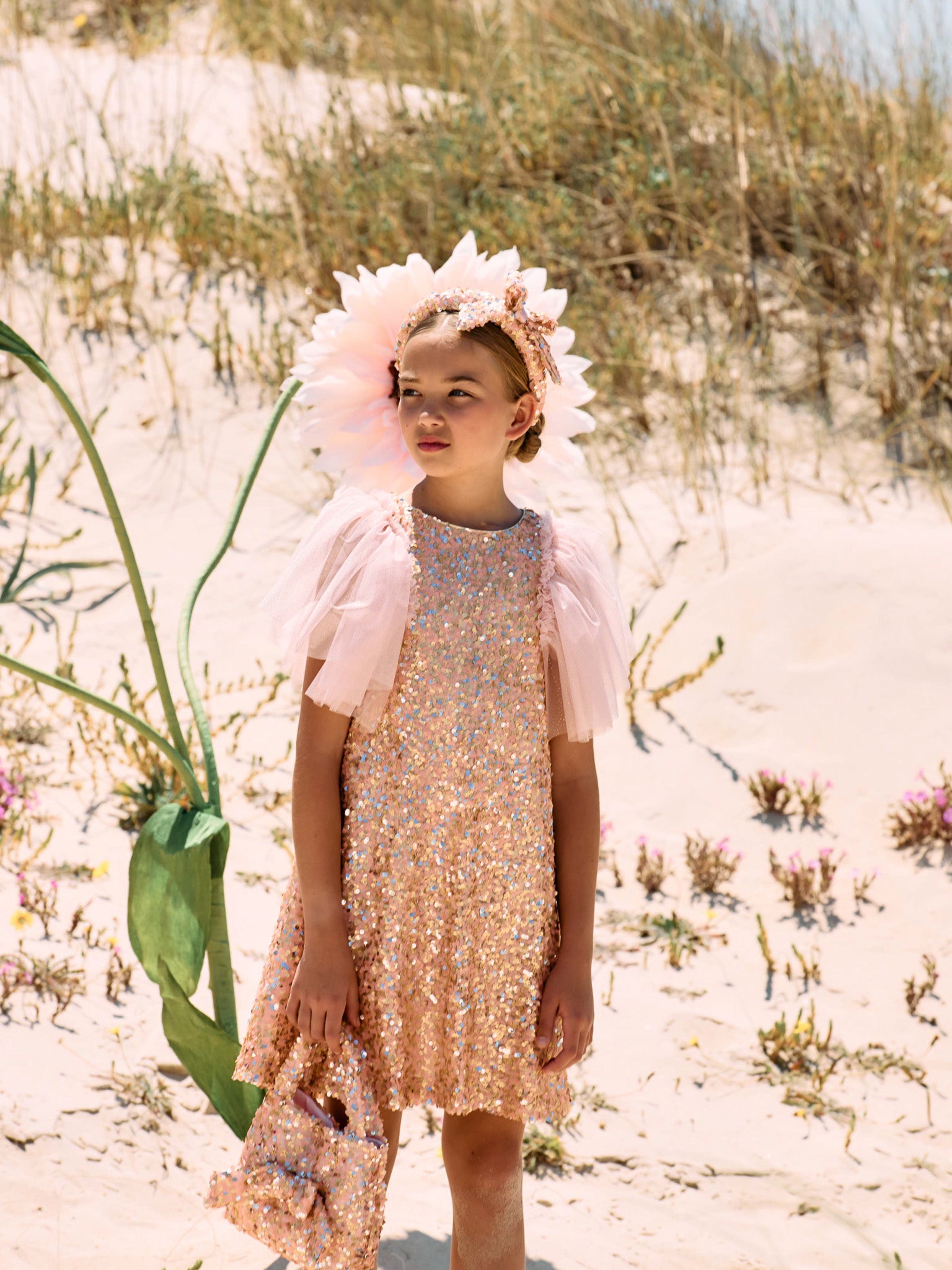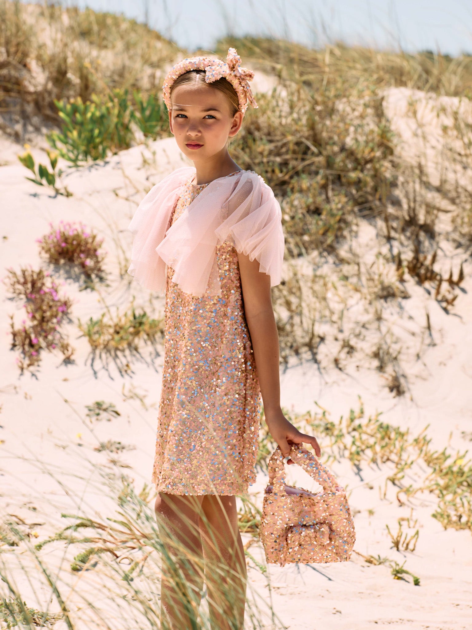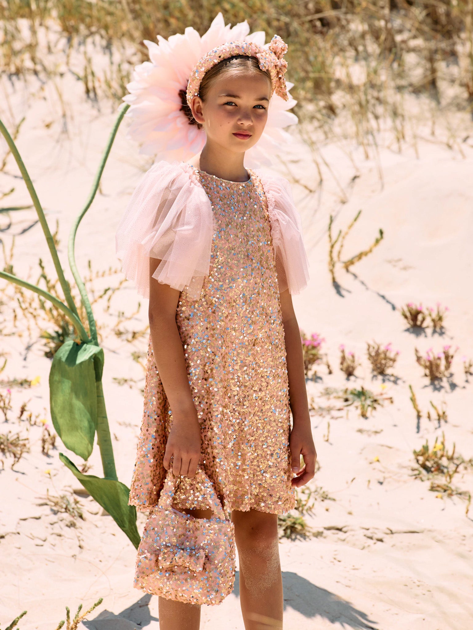 Gorgeous, sparkly dress from Portugese brand Patachou. Made in pink and gold sequin-covered tulle, it drapes into a lovely trapeze silhouette. Sheer tulle waterfall sleeves shimmer with gold glitter speckles. It is fully cotton lined for comfort, with button fastenings on the back.