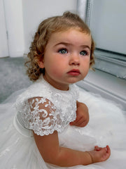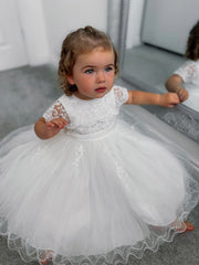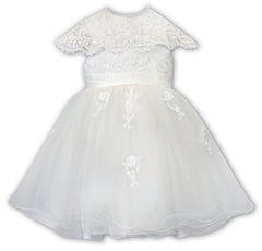 Stunning special occasion ivory vintage lace & tulle dress from British brand Sarah Louise. It has a beautiful cape style lace collar with pearl beaded neckline & a fixed belt in pleated satin around the waist. The zip fastening on the back is finished with a row of fabric covered buttons. The dress is fully lined & trimmed in stiff tulle for added volume